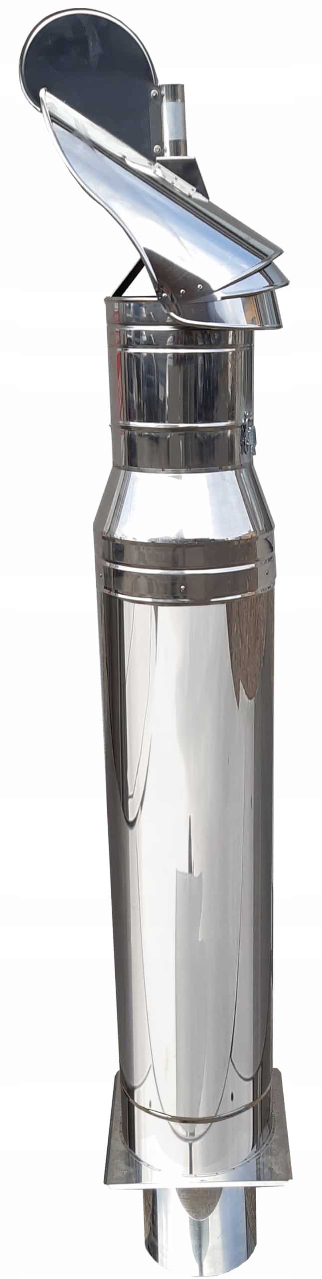 Przedłużenie komina..Wykonane jest w całości z blachy kwasoodpornej. Jest to bardzo istotne ponieważ w rurze wewnętrznej przepływają spaliny i zastosowanie tego gatunku blachy gwarantuje to bardzo długą żywotność nasady. Płaszcz zewnętrzny wykonany jest z blachy nierdzewnej, dzięki czemu zabezpiecza przedłużkę przed korozją, który mogłaby wystąpić na wskutek niesprzyjających warunków atmosferycznych.Na górze przedłużenia znajduje się strażak, który chroni wnętrze komina przed opadami oraz potencjalnymi intruzami (np. ptakami). Zabezpiecza też przed powrotem spalin do komina i poprawia ciąg tworząc w nim podciśnienie.Do prawidłowego działania urządzenia grzewczego, komin spalinowy powinien znajdować się ponad kalenicą. Montaż oferowanej nasady wydłuża komin, dzięki czemu automatycznie poprawia się ciąg w kominie.Przedłużenie kominowe może znaleźć również zastosowanie w przypadku gdy komin już znajduje się ponad kalenicą – zabezpieczy przed wdmuchnięciem spalin do kanałów wentylacyjnych, znajdujących się na tej samej wysokości. Jest to bardzo istotne do prawidłowej wymiany powietrza w domu.Montaż odbywa się poprzez włożenie rury do komina a następnie zakotwienie 4 kołków rozporowych i przykręcenie podstawy śrubami.