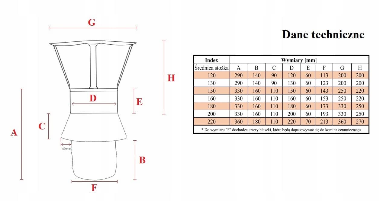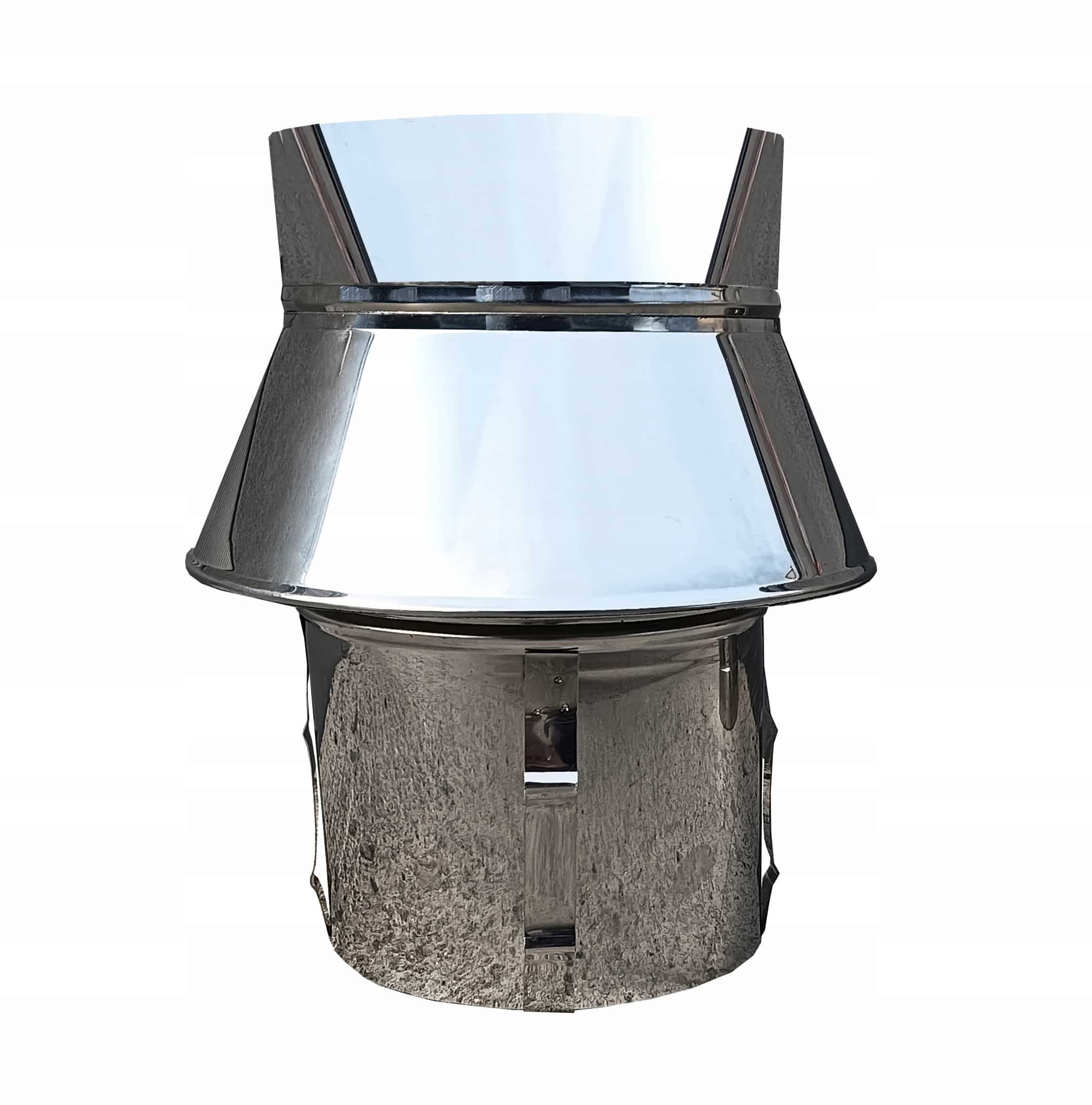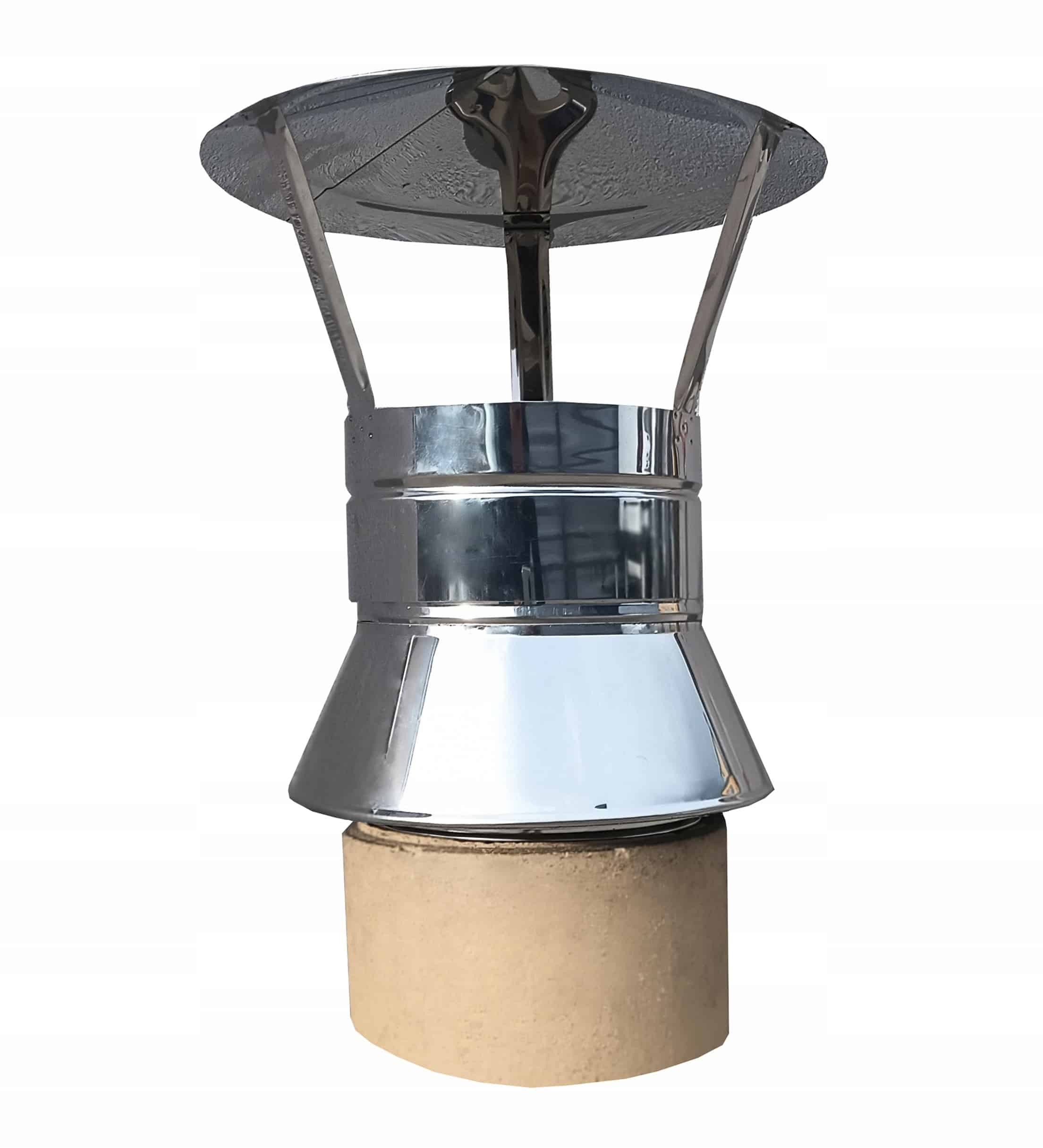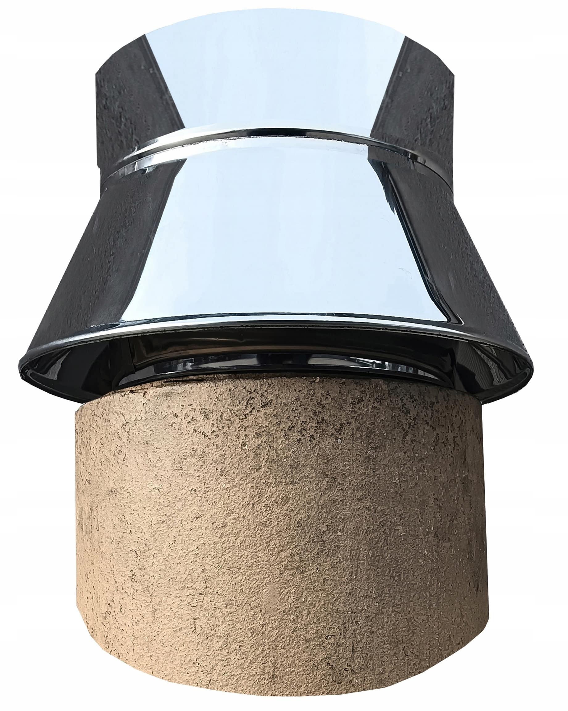 Wykonany z blachy nierdzewnej kwasoodpornej. Zastosowanie nasady ma na celu zabezpieczenie wewnętrznej części komina przed opadami atmosferycznymi, wzmocnienie ciągu kominowego, poprawienie estetyki komina oraz odstraszenie potencjalnych intruzów np. ptaki.Daszek jest bardzo solidny oraz estetyczny. Posiada odpowiednio szeroki kapelusz, dzięki czemu nawet podczas wiatru, deszcz nie dostanie się do komina.Wysokość łapek jest dostosowana do komina spalinowego – nie blokuje wydobywających się spalin.Stosowany jako zakończenie komina spalinowego opalanego takimi paliwami jak: węgiel, drewno, pellet, gaz, olej.Można go również stosować jako zakończenie komina wentylacyjnego (szczególnie zalecany jeśli w pobliżu jest komin spalinowy, z którego mogą spaliny zawiewać na daszek)Montaż odbywa się poprzez nałożenie daszka na stożek, a następnie przykręcenie dwóch elementów wkrętem (wkręta nie ma w zestawie)